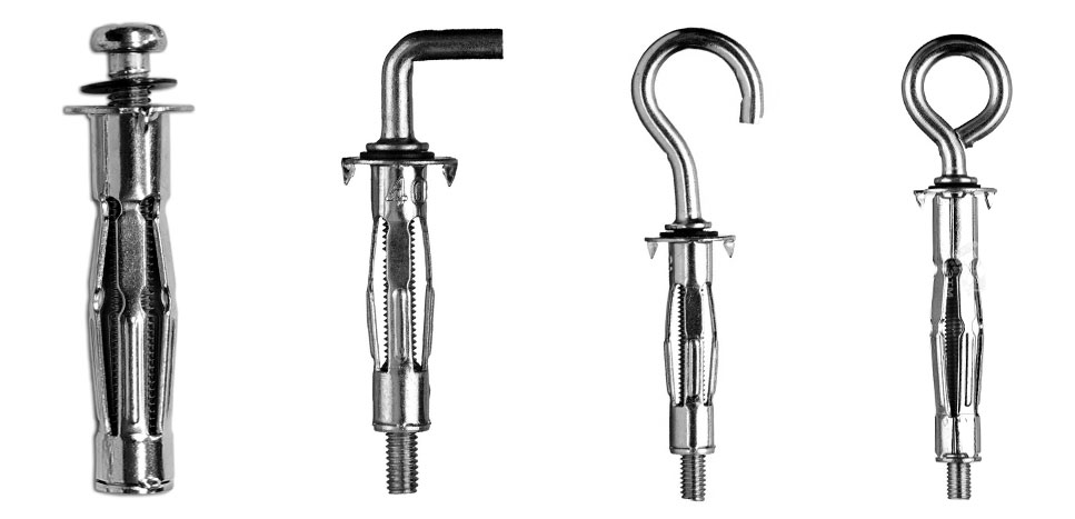 • Крепежи на базе упоров. Анкеры с распорками различных типов. Они обладают высокой несущей способностью, работают с гипсокартоном, фанерой и прочими тонкостенными материалами. Метизы позволяют фиксировать тяжелые конструкции, не разрушая опору.